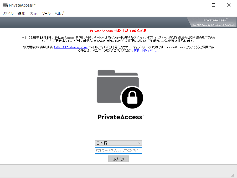 再びSanDiskSecureAccessV3_win.exeから起動します。ここで言語を選べるので日本語を選び、パスワードを入力してログインします。