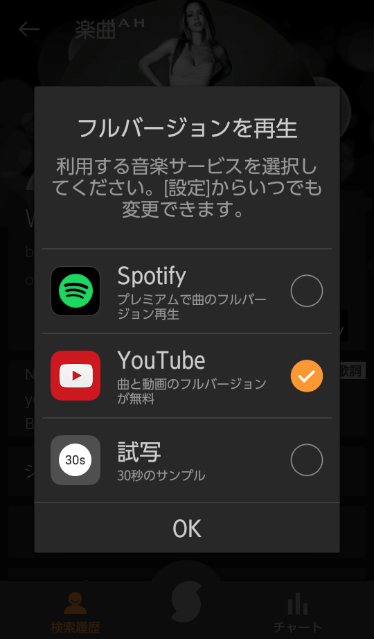 再生をボタン押すと何で再生するかを選択できます。ここではYOUTUBEでのフルバージョン再生を選択しています。