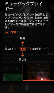 ミュージックプレイヤーのチュートリアル画面になりますので、確認してタップしていけばYOUTUBEでの再生が始まります。