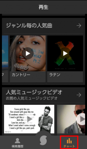 画面下のアイコンのチャートをタップするとジャンル毎の人気曲や人気ミュージックビデオが確認できます。